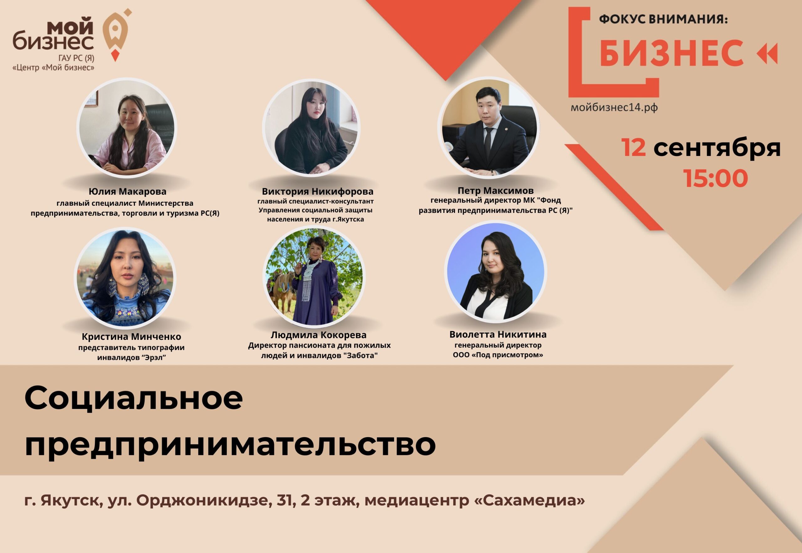 Центр «Мой бизнес» приглашает всех желающих принять участие в работе круглого стола «Фокус внимания. Бизнес. Социальное предпринимательство» 12 сентября в медиацентре «Сахамедиа».