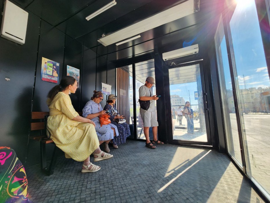 Кондиционер в закрытом автобусном павильоне «к/т Центральный» установлен на 19 градусов, внутри комфортно, градусов на 5 прохладнее чем на улице, потому что дверь постоянно открывается, пассажиры заходят и выходят. В павильоне также есть видеокамера наблюдения.