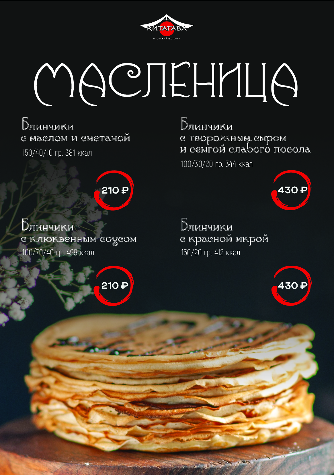 — японский ресторан «Китагава» и ресторан грузинской кухни «Барашек» угощает блинами с маслом и сметаной, с творожным сыром и семгой, с красной икрой, с клюквенным соусом.