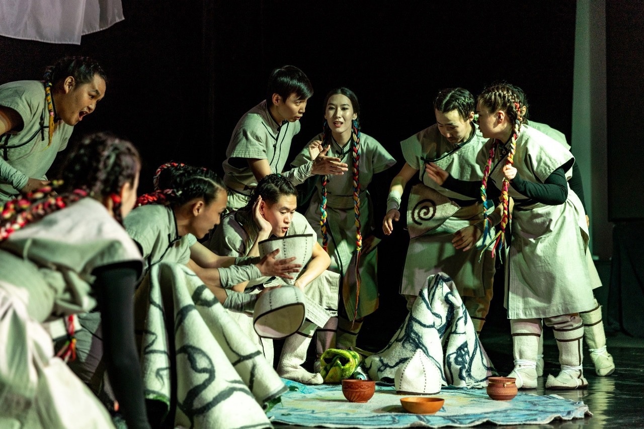 Напомним, премьера постановки состоялась в мае 2023 года в Якутске, а в сентябре итог кропотливой работы оценили в Горно-Алтайске. Оба раза команда имела оглушительный успех, но подготовка к ней началась еще в 2022 году, став дипломным проектом студентов кафедры театрального искусства, обучающихся на курсе профессора Андрея Борисова. Дело в том, что группа — интернациональная, обучались ребята из Алтая и Тывы. Со временем постановка стала частью проекта «Восхождение на Ус-Сумэр» в рамках федеральной программы «Приоритет-2030. Дальний Восток». Для его реализации были приглашены алтайские и тувинские профессионалы: