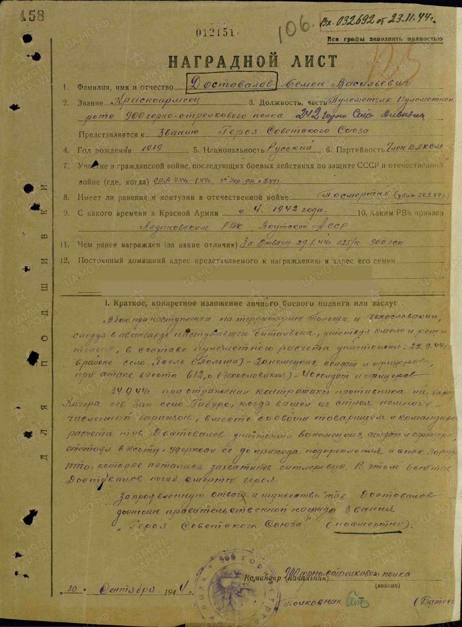 «В наступательных боях на территории Польши и Чехословакии, следуя в авангарде наступающего батальона, действуя смело и решительно, товарищ Достовалов проявил отвагу и геройство. 22 сентября в бою в районе села Ясель, расчёт станкового пулемёта «Максим», в который входили сержант Михаил Сиякаев, рядовые Семён Достовалов и Николай Андрющенко, по опушке леса зашел на фланг немцам, обеспечил продвижение пехотинцев, поддержал их своим огнём и облегчил занятие села. В этом бою составом расчёта уничтожено 20 немцев.