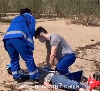 Человеку стало плохо на диком пляже 203 мкрн. На первом кадре его пытаются откачать медики, делают искусственное дыхание.