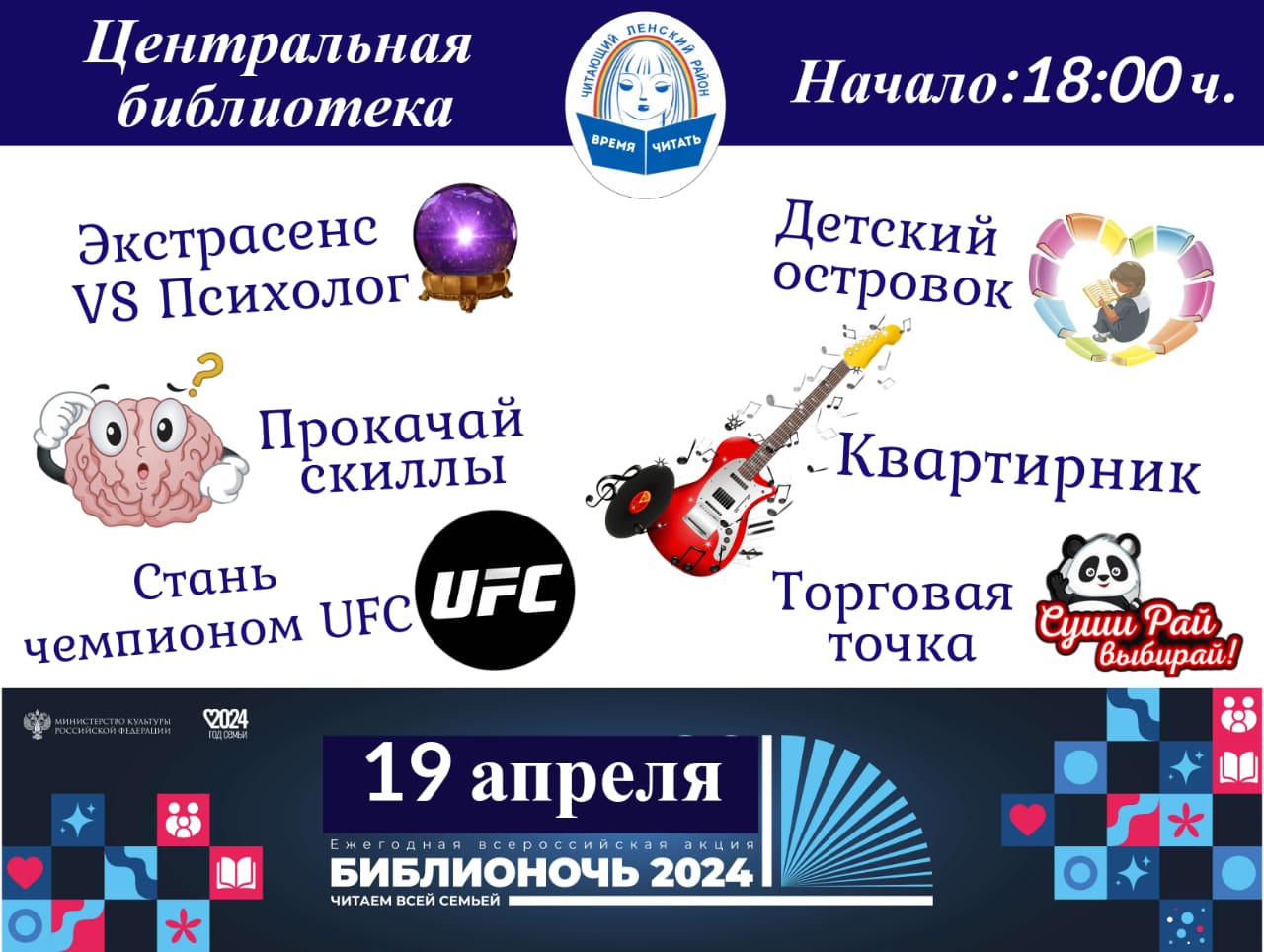 19 апреля Центральная библиотека приглашает жителей и гостей Ленска на увлекательную, познавательную, драйвовую и вкусную БИБЛИОНОЧЬ - 2024! Начало в 18:00