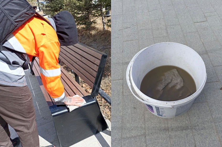 YAKUTIA.INFO. Необычное для Якутска явление запечатлел корреспондент «Якутия.Инфо» прямо в центре города. В кои-то веки сотрудники в спецодежде влажными тряпками протирали от пыли новые скамейки по проспекту Ленина.