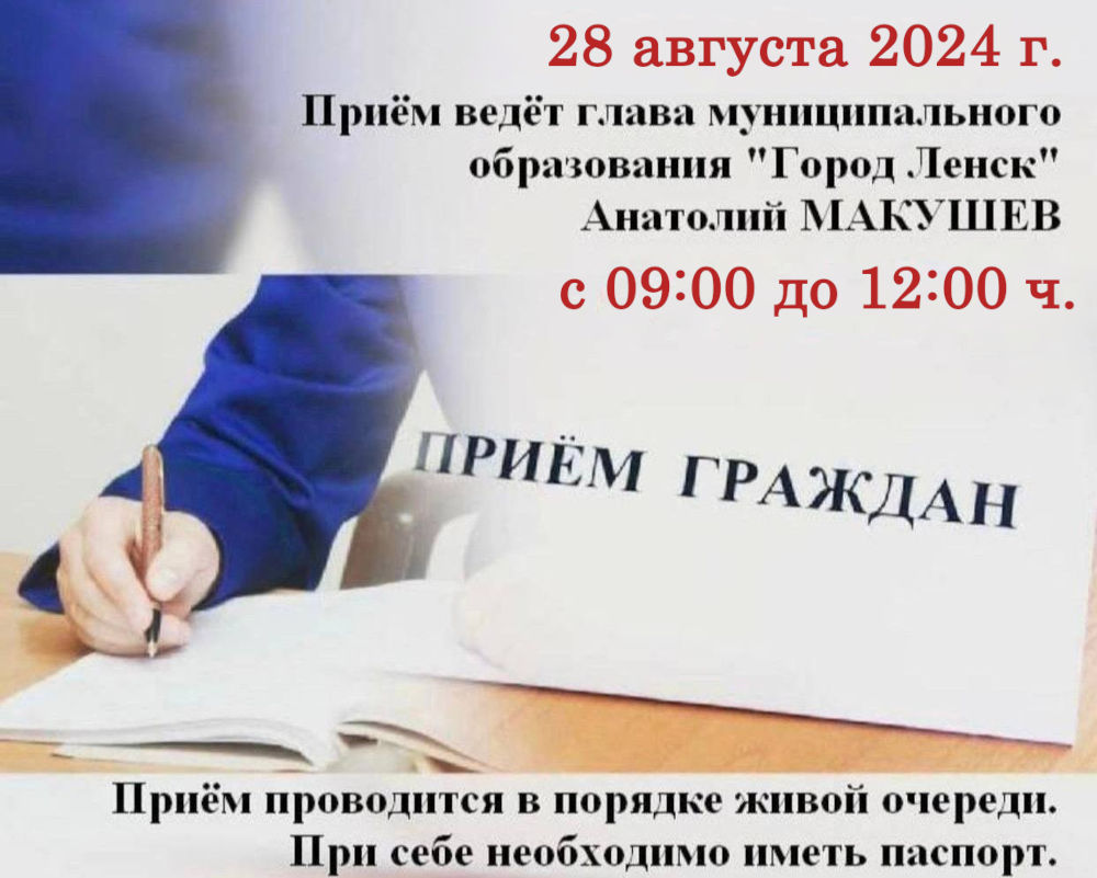 28 августа с 09:00 до 12:00 ч. глава муниципального образования "Город Ленск" Анатолий Макушев проведёт приём граждан.