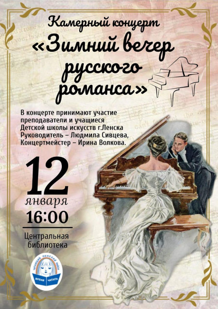 12 января в 16:00 центральная библиотека приглашает на камерный концерт «Зимний вечер русского романса» В концерте принимают участие преподаватели и учащиеся Детской школы искусств г.Ленска.