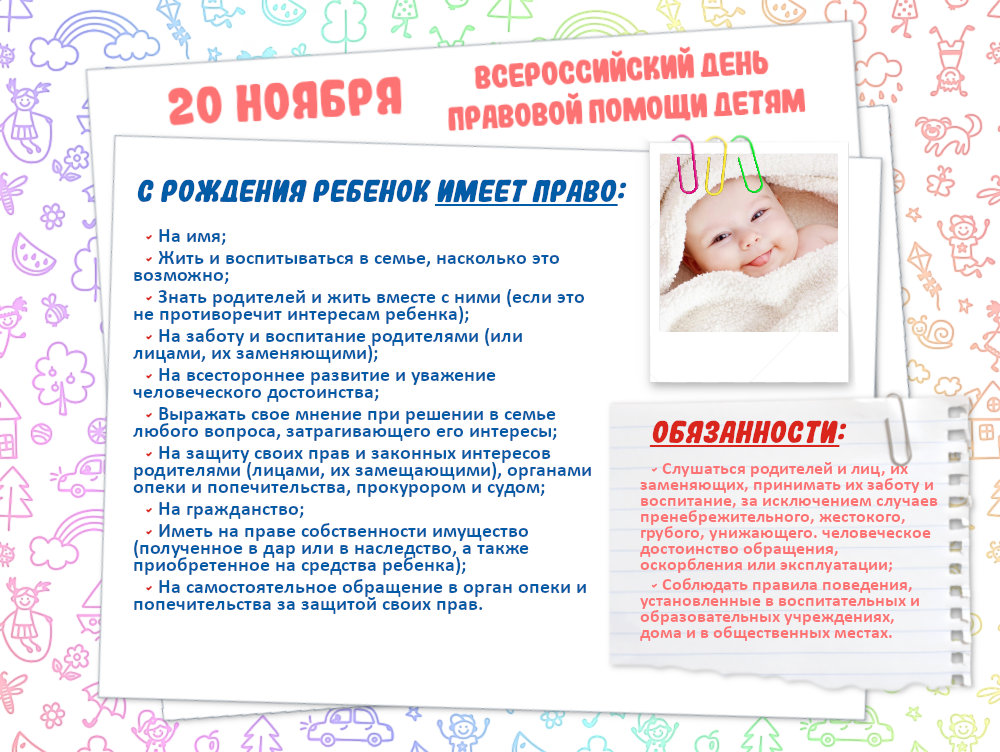 С момента рождения ребенок обладает рядом прав, которые защищаются законом. Эти права включают в себя право на жизнь, здоровье, образование и развитие. Важно, чтобы родители и общество в целом обеспечивали условия для реализации этих прав.
