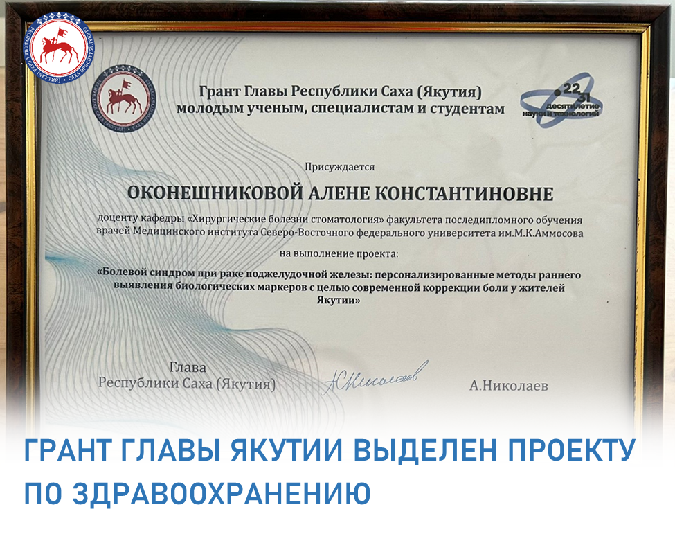 Грант главы Якутии выделен проекту по здравоохранению Грант в категории «Молодые ученые, специалисты и студенты» получен на выполнение проекта «Болевой синдром при раке поджелудочной железы: